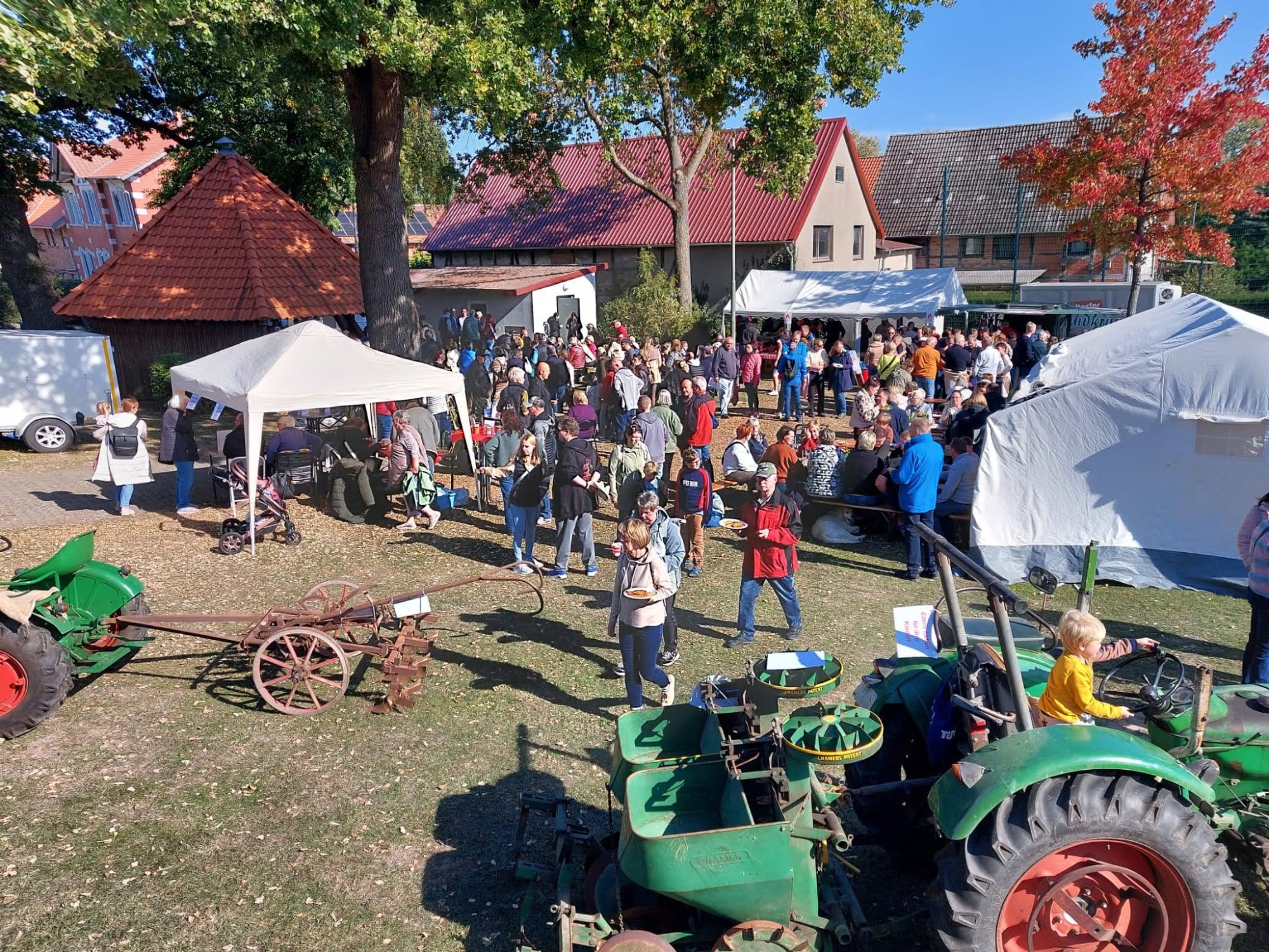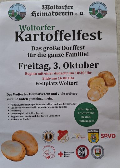 Am 03.10.2025 trafen sich an die 1000 Besucher auf dem Woltorfer Festplatz. Dort gab es neben historischen auch hochmoderne Erntefahrzeuge für die Kartoffelernte zu bestaunen. Es wurden 100 Kg Kartoffelpuffer, 12 Kuchen, 60 Portionen Kartoffelsuppe und 60 Kg Pommes zubereitet und verkauft. In Zusammenarbeit mit der JGS Woltorf, den Landfrauen, dem Sozialverband und dem Förderverein der Feuerwehr hat der Heimatverein ein wirklich gelungendes Fest ausgerichtet. An dieser Stelle ein großes Dankeschön an alle Helferinnen und Helfern.